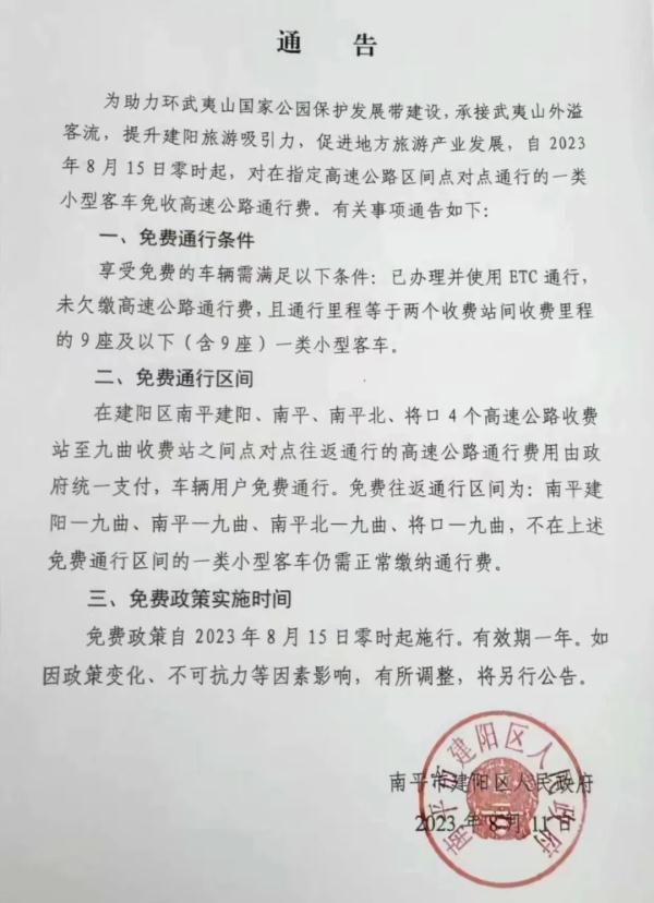 在建阳区南平建阳、南平、南平北、将口4个高速公路收费站至九曲收费站之间点对点往返通行的高速公路通行费用由政府统一支付,车辆用户免费通行。