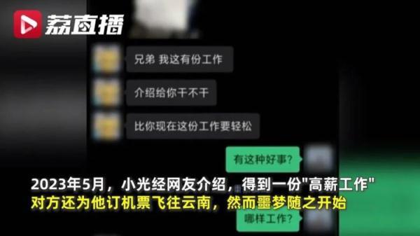 小光:他们说在云南那边,他们订飞机票,我就去了云南。到云南以后又让我去西双版纳,坐车去西双版纳的时候,要上他们车,说带去工作的地方。一上车就被他们控制住了,当天晚上直接带到山里面,他们十几个人逼着我强行偷渡。翻过山发现是缅甸那边,他们又找司机把我们强行送到公司里面。
