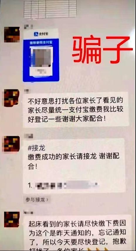 各位家长不要随意向他人透露微信群、QQ群的群名称和二维码等信息,保存好班主任老师的电话,了解学校的收费政策和流程,切勿轻信群成员要求转账收费的信息。