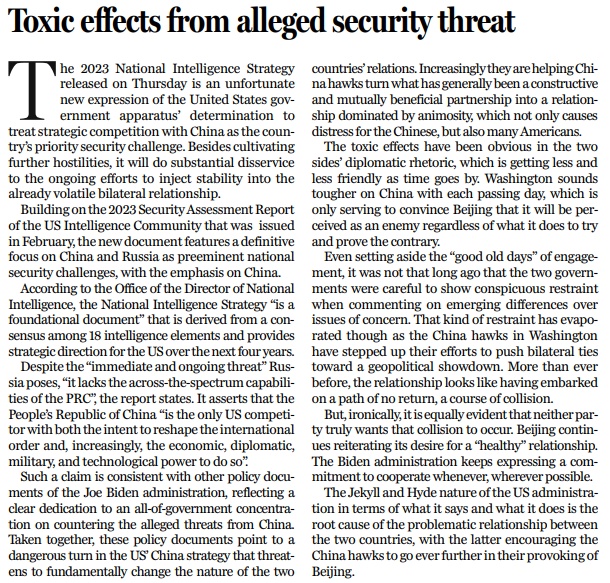 美国国家情报总监海恩斯日前公布的2023年《国家情报战略》报告表明,华盛顿执意将与中国的战略竞争视为首要安全挑战。此举不仅会进一步滋生敌对情绪,还将破坏为稳定双边关系所作出的持续努力。