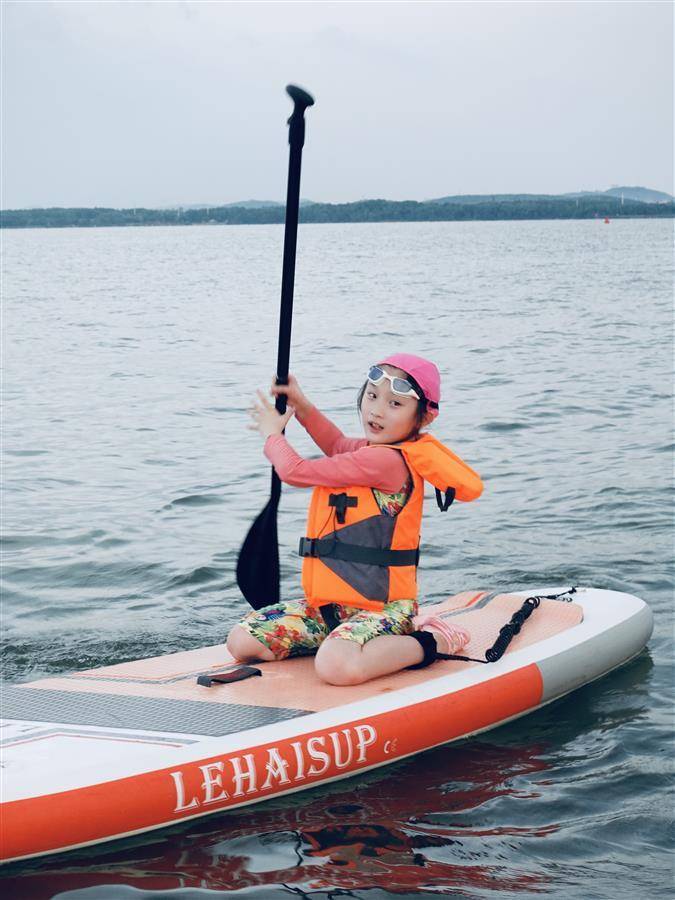 她介绍,桨板分为竞速型的硬板和休闲使用的充气板,业余爱好者多会使用后者,“充气前仅有大号双肩包的大小,可以轻松地随身携带,充气后长度可达3.3到4.2米,重量一般在9-11公斤,一名成年女性可以轻松提拿。”