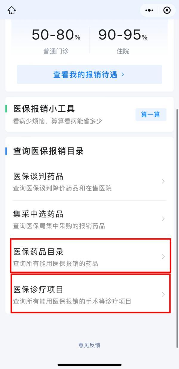 ● 点击“医保报销待遇”,还可查看到所在城市的医保报销目录,什么药能报,比例多少,一清二楚。