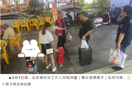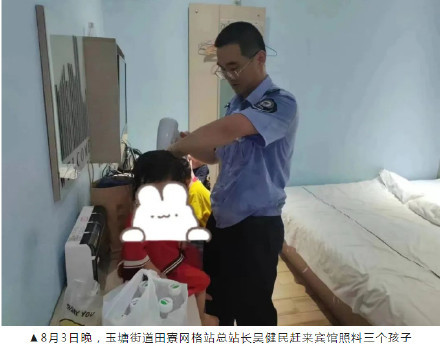 民警和社区网格员立即赶来,经大伙儿协商,宾馆老板愿意收留三个孩子先免费入住。网格员们则带来食物和干净衣物,喂孩子们吃饭还帮他们洗了澡,并留人在宾馆专程看护。直至8月4日傍晚,网格员、民警经细致摸排,终于联系上了那名年轻男子,也是三名孩子的父亲代某。