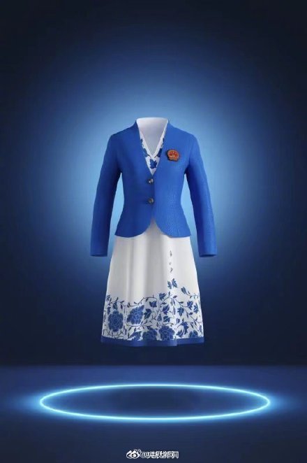 白与蓝的主色调碰撞出闪耀星辰的遐想,象征着群星闪耀的体育拼搏精神,礼服设计上还融入了青花瓷、牡丹等中国元素,彰显中国文化魅力。