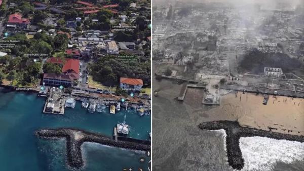 夏威夷西北部的拉海纳在此次火灾中损失最为严重,几乎成为废墟。拉海纳大火前后对比照↓