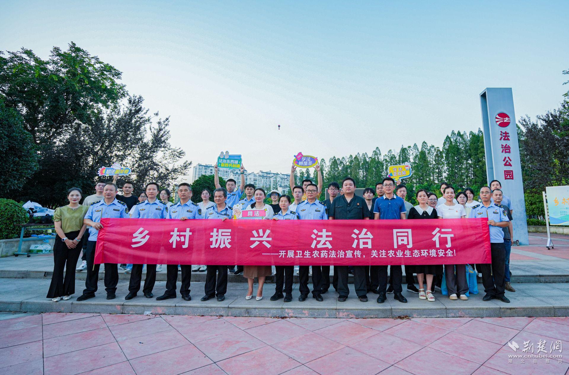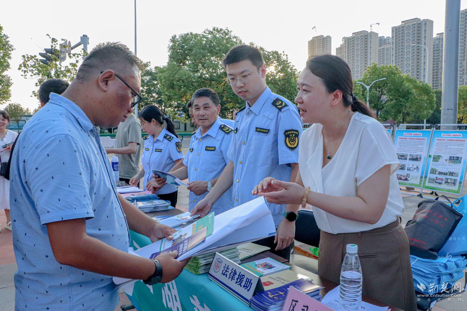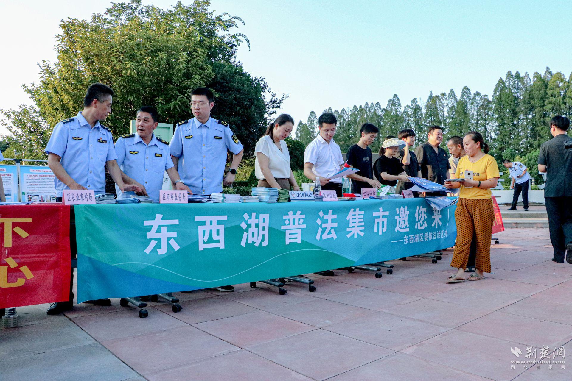 荆楚网(湖北日报网)讯 (记者文放 通讯员罗晶洁)8月10日,在首个全国生态日即将来临之际,伴着落日余晖,一场别开生面的“普法集市”在走马岭街法治广场拉开了帷幕。本次“普法集市”由东西湖区委依法治区办联合该区司法局、区农业农村局、区法院走马岭法庭、区生态环境分局、区市场监管局、走马岭街道办事处等多部门举办,主题为“开展卫生农药法治宣传,关注农业生态环境安全”。