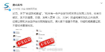 @萧山发布:近日,关于“转运珠式卖淫”、“杭州有一条产业链”的相关言论在网上流传,经官方核实,系不实信息。目前,发布人贾某(女,22岁)因虚构事实扰乱公共秩序,已被公安机关依法作出行政拘留处罚。请大家不信谣不传谣,非经权威渠道证实,不要轻信盲目转发。