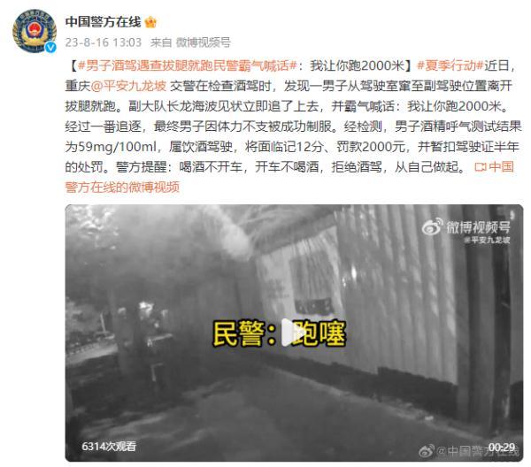 近日,重庆@平安九龙坡交警在检查酒驾时,发现一男子从驾驶室窜至副驾驶位置离开拔腿就跑。副大队长龙海波见状立即追了上去,并霸气喊话:我让你跑2000米。经过一番追逐,最终男子因体力不支被成功制服。经检测,男子酒精呼气测试结果为59mg/100ml,属饮酒驾驶,将面临记12分、罚款2000元,并暂扣驾驶证半年的处罚。警方提醒:喝酒不开车,开车不喝酒,拒绝酒驾,从自己做起。