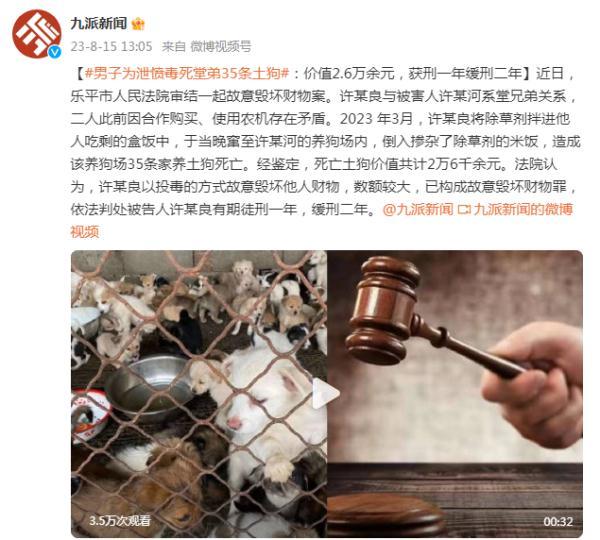 近日,乐平市人民法院审结一起故意毁坏财物案。许某良与被害人许某河系堂兄弟关系,二人此前因合作购买、使用农机存在矛盾。2023年3月,许某良将除草剂拌进他人吃剩的盒饭中,于当晚窜至许某河的养狗场内,倒入掺杂了除草剂的米饭,造成该养狗场35条家养土狗死亡。经鉴定,死亡土狗价值共计2万6千余元。