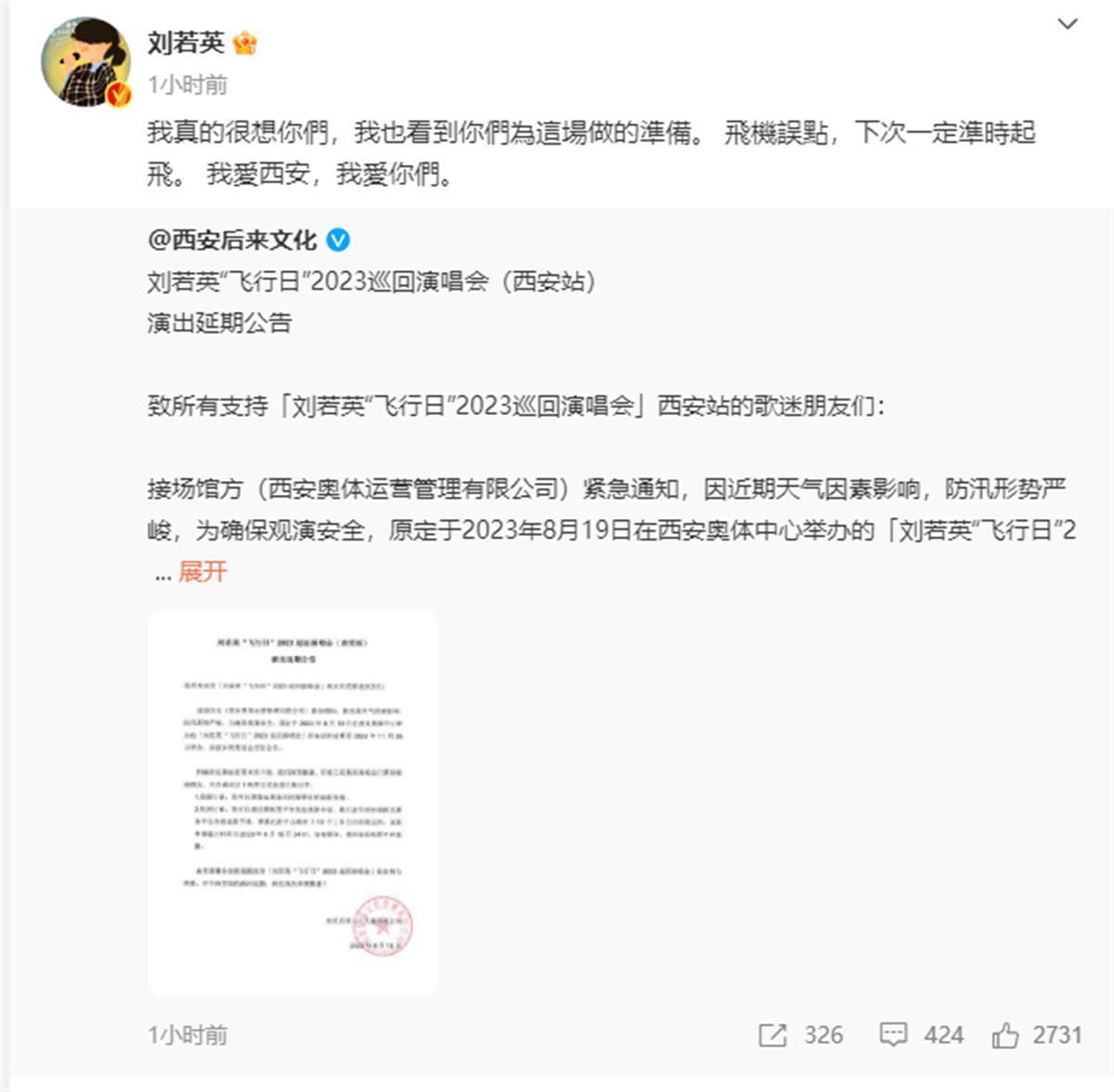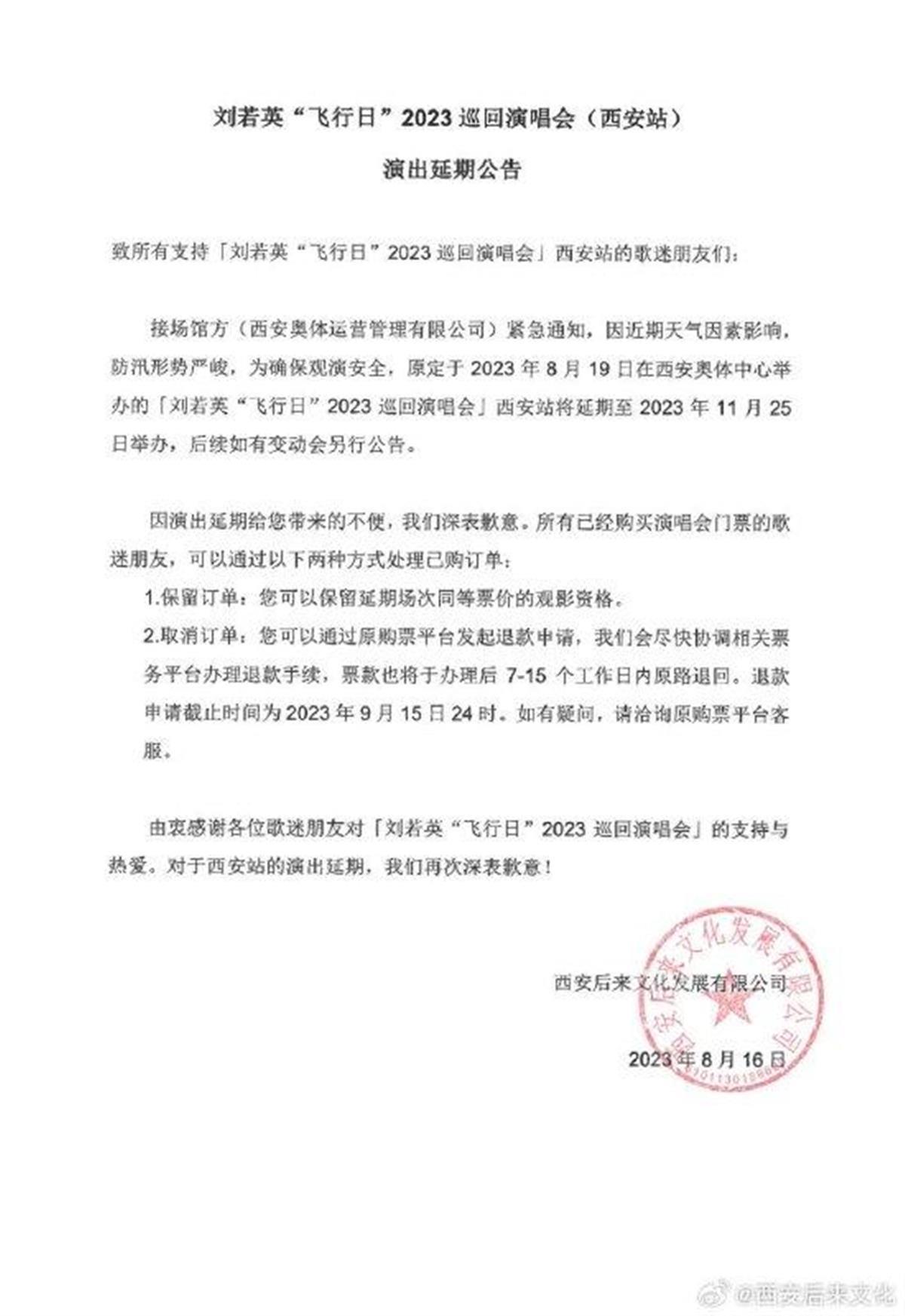 8月16日,刘若英西安演唱会宣布延期:“接场馆方(西安奥体运营管理有限公司)紧急通知,因近期天气因素影响,防汛形势严峻,为确保观演安全,原定于2023年8月19日在西安奥体中心举办的刘若英‘飞行日’2023巡回演唱会西安站将延期至2023年11月25日举办,后续如有变动会另行公告。 ”随后,刘若英回应表示:“我真的很想你们,我也看到你们为这场做的准备。飞机误点,下次一定准时起飞。我爱西安,我爱你们。”(据8月16日红星新闻)
