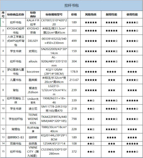 本次样品中护脊书包各项的测试指标比拉杆书包要好,个别的拉杆书包存在两项测试指标没有通过测试要求的情况;