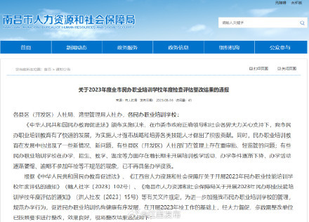 江西发布获悉,为进一步加强民办职业培训学校的管理、规范办学行为,南昌市对该市民办职业培训学校进行了2023年度检查评估,并要求需整改单位进行整改,刚刚,南昌市人社局发布了整改结果通报。
