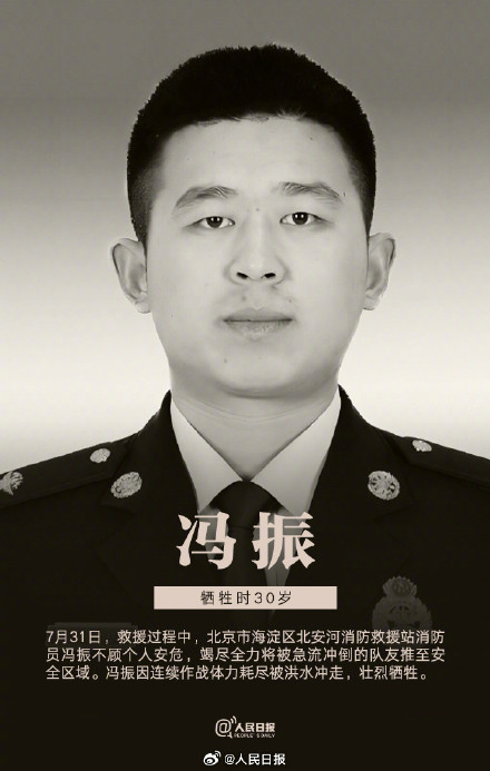 冯振,1992年12月生,中共党员,生前系北京市海淀区北安河消防救援站特勤一班班长、西小营小型站站长,一级消防士消防救援衔。7月31日12时15分,冯振同志在北安河北路带队营救被山洪围困的群众时,突遭山洪暴涨,因连续作战体力耗尽被山洪冲走。12时47分,冯振同志被营救,经全力抢救无效,于18时22分不幸壮烈牺牲,年仅30岁。