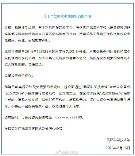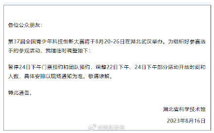 今天(8月16日),湖北省科学技术馆、武汉科学技术馆发布最新通告,具体内容如下