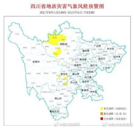 根据四川省地质环境条件,结合四川省气象台天气预报情况,8月16日20时到8月17日20时,全省地质灾害气象风险预警结果如下: