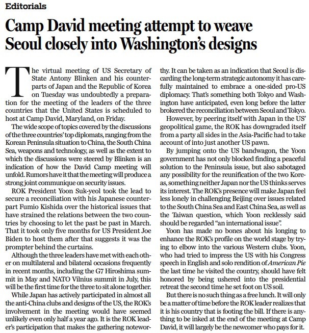美国国务卿布林肯、日本外相林芳正、韩国外长朴振8月15日举行视频会议,为即将于18日举办的戴维营峰会做准备。韩国千方百计挤进美国主导的小圈子,到头来不过是火中取栗,贻笑大方。