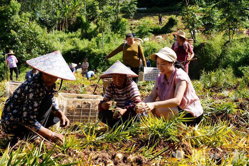 覃芳(右一)与村民一起采收百合