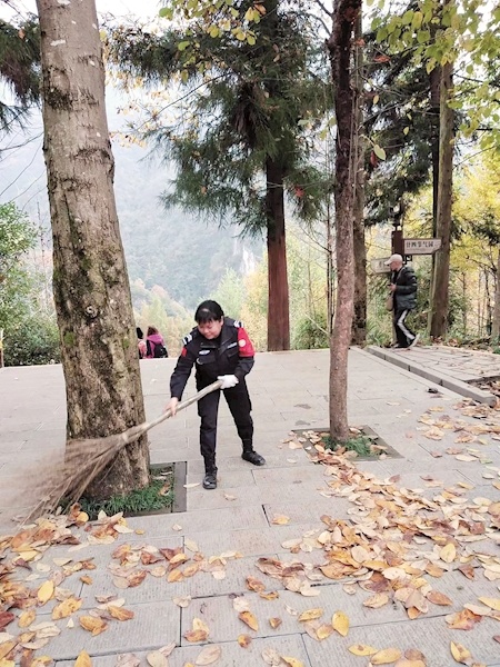神农坛景区海拔近2000米,山顶的银杏叶目前已开始变黄飘落。贾纯月扫完落叶,又背起鼓风机吹走台阶上的落叶,然后一一清除石头上的鸟屎、指示牌上的雨污。在景区工作26年,她立足岗位兢兢业业,还拾金不昧100余次,总金额达40余万元。