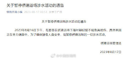 广西北海侨港浴场管理处17日发布通告:8月16日下午,有游客在侨港浴场下海时疑似被不明鱼类咬伤,具体原因正在全力调查中,为了确保游客人身安全,现暂停侨港浴场的一切涉水活动。(银海侨港小镇)