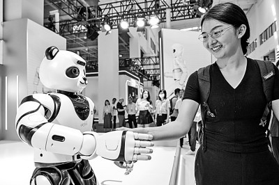 8月16日,2023世界机器人大会现场,一位女士与智能机器人握手。新华社记者 彭子洋摄