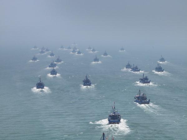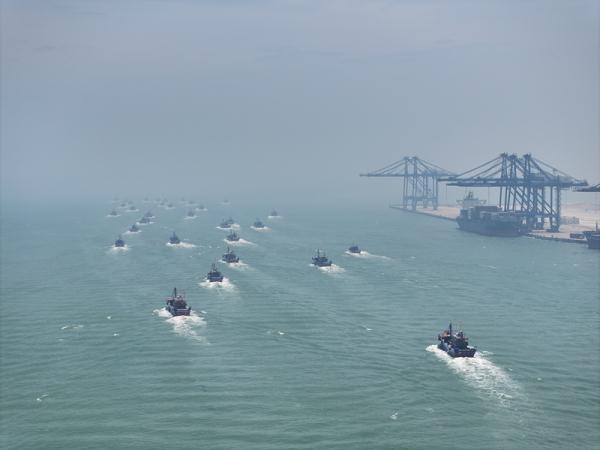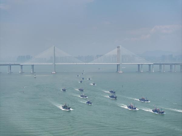 为期3个半月的伏季休渔期于8月16日12时结束,在福厦高铁泉州湾跨海大桥附近海域,渔船马达轰鸣,渔民们正在开启新一轮出海作业。