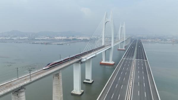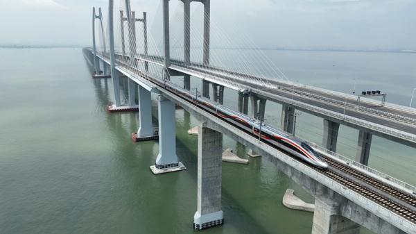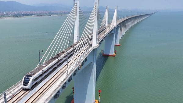 8月16日,智能复兴号驶过福厦高铁安海湾跨海大桥。南昌铁路局供图