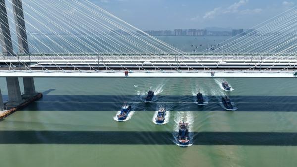 8月16日,动车组与渔船共同驶过福厦高铁泉州湾跨海大桥。南昌铁路局供图