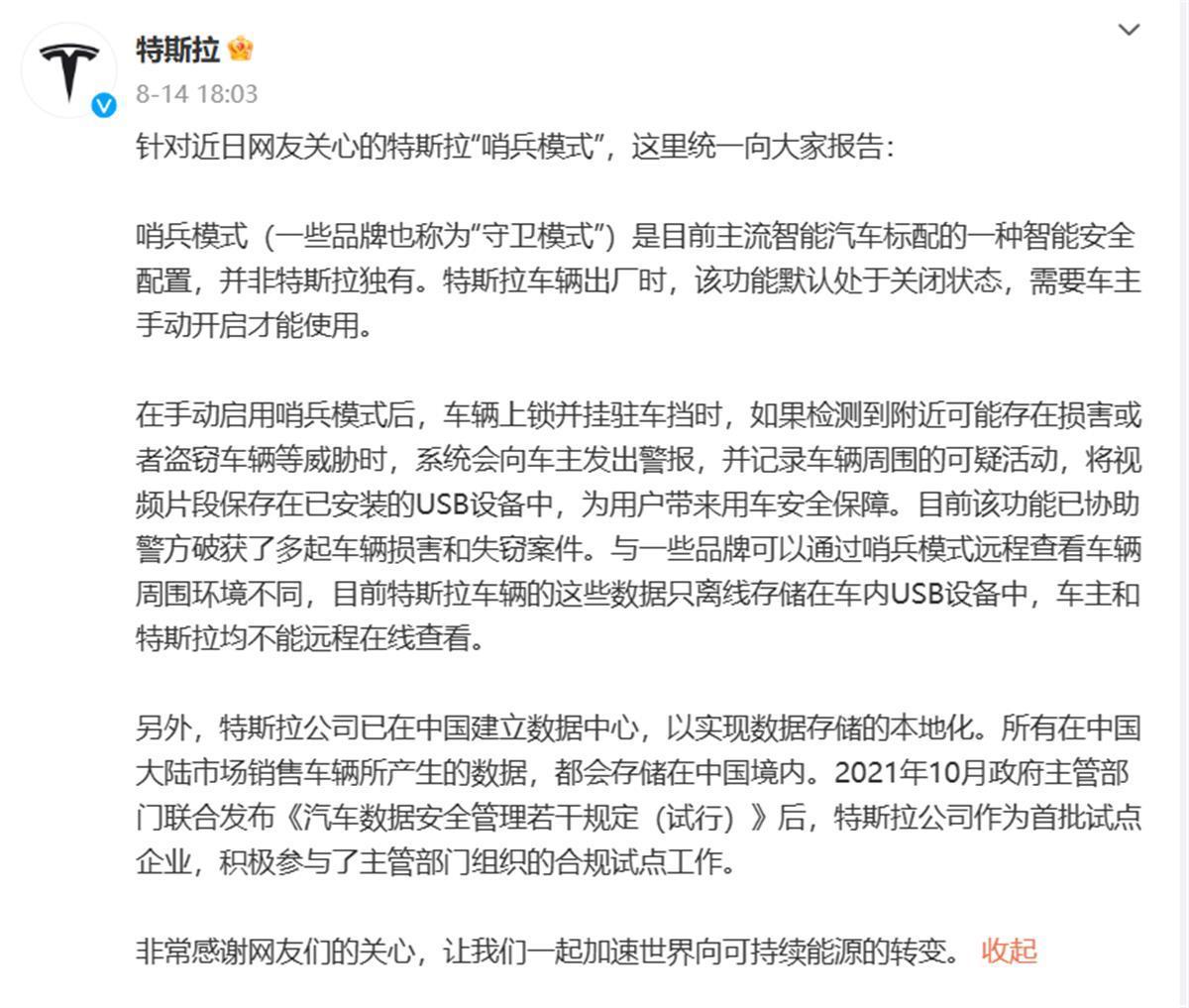 8月14日,特斯拉公开回应网友关切称,哨兵模式(一些品牌也称为“守卫模式”)是目前主流智能汽车标配的一种智能安全配置,并非特斯拉独有。特斯拉车辆出厂时,该功能默认处于关闭状态,需要车主手动开启才能使用。人员在手动启用哨兵模式后,车辆上锁并挂驻车挡时,如果检测到附近可能存在损害或者盗窃车辆等威胁时,系统会向车主发出警报,并记录车辆周围的可疑活动,将视频片段保存在已安装的USB设备中,为用户带来用车安全保障。目前该功能已协助警方破获了多起车辆损害和失窃案件。与一些品牌可以通过哨兵模式远程查看车辆周围环境不同,目前特斯拉车辆的这些数据只离线存储在车内USB设备中,车主和特斯拉均不能远程在线查看。