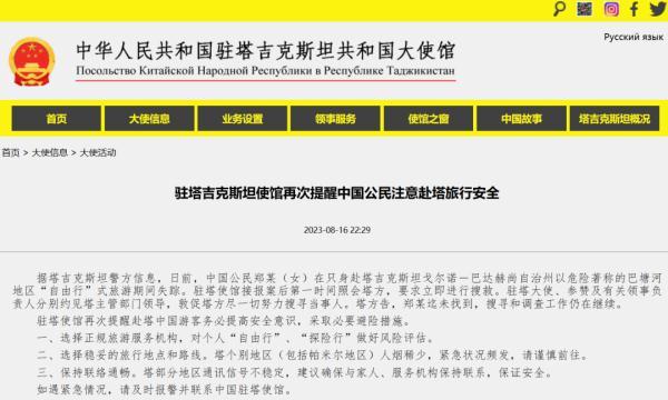 8月16日,中国驻塔吉克斯坦大使馆发布消息称,近日一中国公民在塔吉克斯坦旅游期间失踪,使馆提醒中国公民注意赴塔旅行安全。