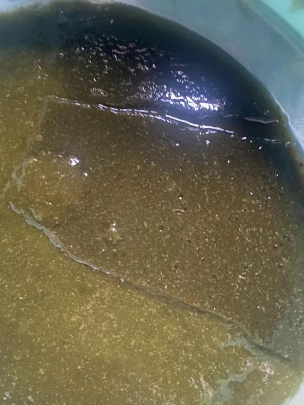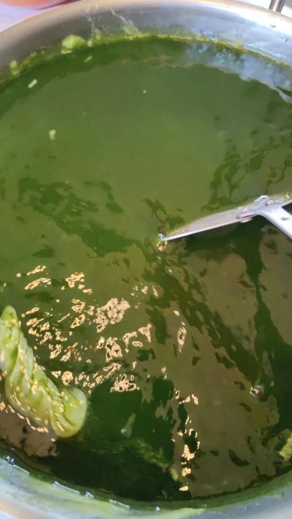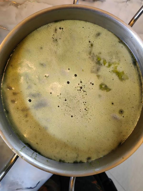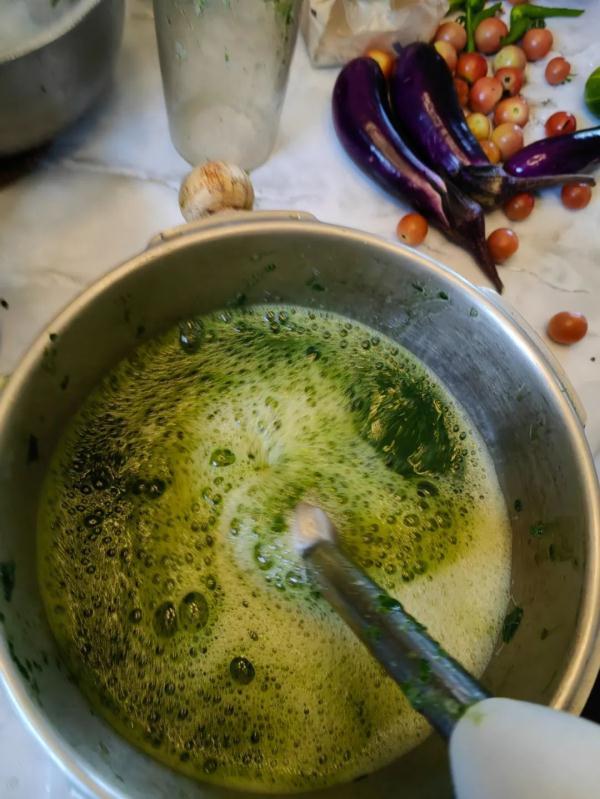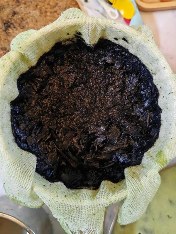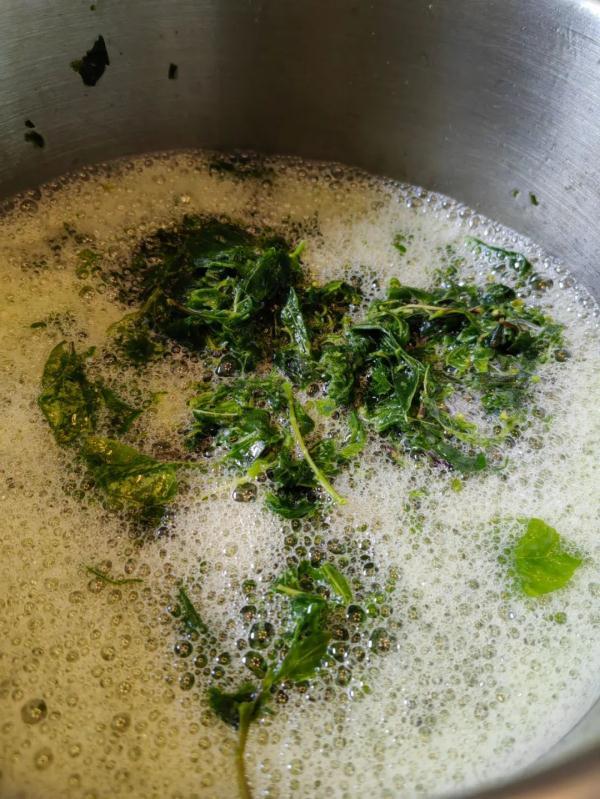 5、把汁液过滤一遍,去除细小的叶渣,再加入草木灰水搅拌均匀,只需15分钟左右,青绿的汤水就能逐渐凝固成青翠滑嫩的观音豆腐。