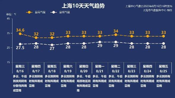 有冷空气的渗透,本周内高温熄火,最高基本徘徊在32~33℃。分散的阵雨或雷雨没有消停,同时也需要防范强对流天气。由于湿度较大,闷热的感觉犹在。周日到下周初,申城恢复夏日晴热主题,预计最高气温回到高温线附近,午后存在热雷雨的可能,天气变幻,小心防暑,雨伞常备。