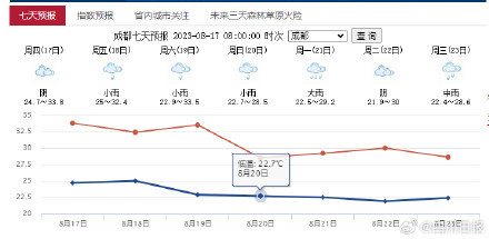 昨日16时,成都市气象台解除高温蓝色预警,但这几天闷热依然持续。据最新消息,热过这一波成都降温在路上了!受降雨影响,本周日(8月20日)开始,成都最高气温将跌至28°C,最低气温只有22°C。换季期间注意加减衣物,预防感冒!(成都气象、四川省公共气象服务网)