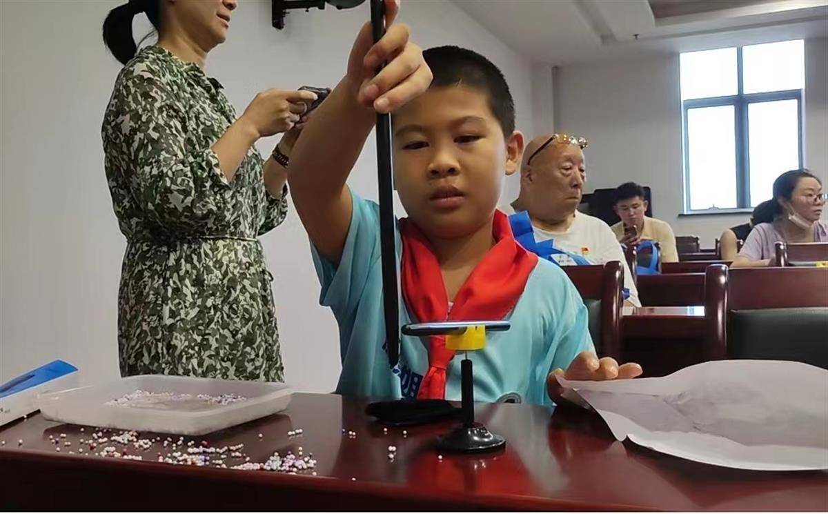 为了让孩子们进一步了解静电是如何产生的,检测员带着孩子们进行了两个小实验:用丝绸用力摩擦玻璃棒多次后将玻璃棒顶端接近装有彩色泡沫的托盘,托盘里的彩色泡沫被吸附在了玻璃棒上,这是因为摩擦产生了静电,静电就会吸附彩色泡沫,工业上可以用此类方法进行静电除尘工作。