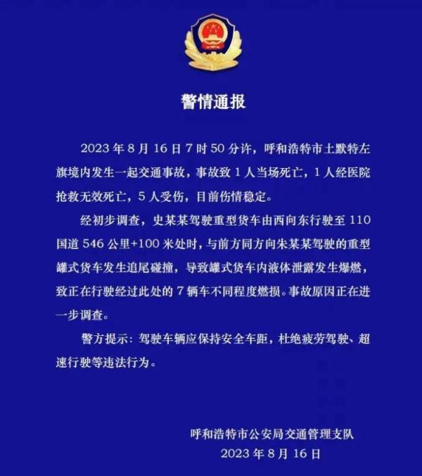 16日晚22时33分,呼和浩特市公安局官方微信公众号发布警情通报,显示事故致1人当场死亡,1人经医院抢救无效死亡。