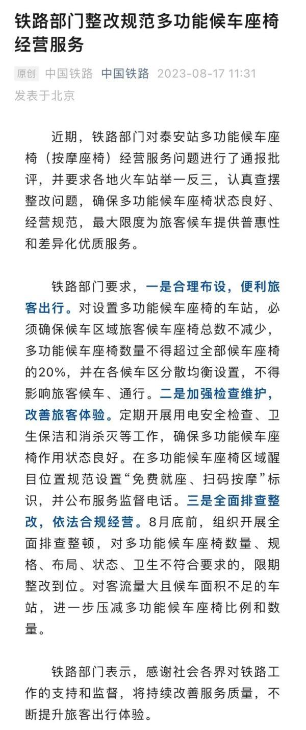 文中指出,近期,铁路部门对泰安站多功能候车座椅(按摩座椅)经营服务问题进行了通报批评,并要求各地火车站举一反三,认真查摆整改问题,确保多功能候车座椅状态良好、经营规范,最大限度为旅客候车提供普惠性和差异化优质服务。