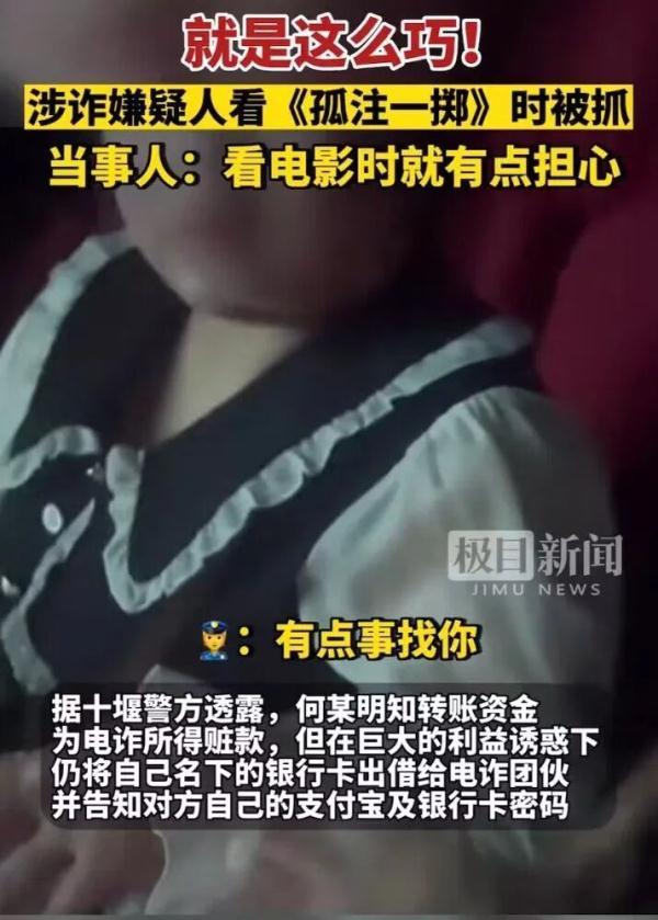 8月14日,湖北省十堰市公安局茅箭区公安分局民警根据线索不断深挖溯源,远赴贵州省六盘水市成功抓获一名涉嫌掩饰、隐瞒犯罪所得罪嫌疑人何某。万万没想到,民警在研判其位置时发现,她正在电影院观看反诈电影《孤注一掷》。于是民警当即赶赴电影院,将其一举抓获。