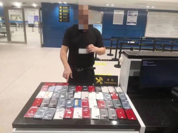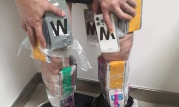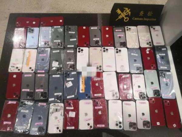 经检查,关员在该名旅客大腿、小腿部发现用胶带捆绑的50台旧手机。目前该案已按规定作进一步处置。