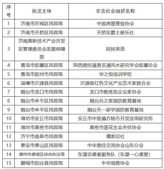 为进一步加大对非法社会组织的打击整治力度,充分发挥社会监督作用,山东省民政厅近日向社会集中公布一批我省民政部门依法取缔、劝散的非法社会组织名单,请社会公众提高警惕,避免上当受骗。社会公众如果发现名单中的非法社会组织仍在开展活动的,可依法向公安机关报案。