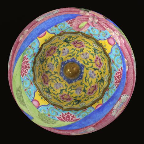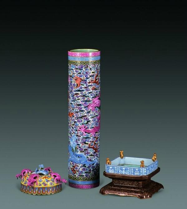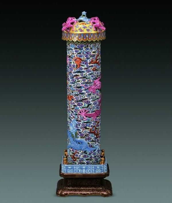这件清代粉彩镂空云龙纹亭式香薰珍藏于中国国家博物馆。器仿铜质香薰,由盖、台、座三部分组成,盖呈钟式,堆贴有蟠龙纹,黄地粉彩绘云蝠纹。身呈圆筒形,镂雕粉彩云龙纹、飞蝠纹等。台座为方形,下部施酱釉,上金彩绘花卉纹。上部以蓝彩饰回栏和台基式纹样,四角堆贴蹲狮,形象生动。此器制作工艺复杂,集镂空、堆贴、彩绘于一身,显示出乾隆时期高超的烧瓷技艺,体现出美观与实用的完美结合。