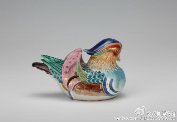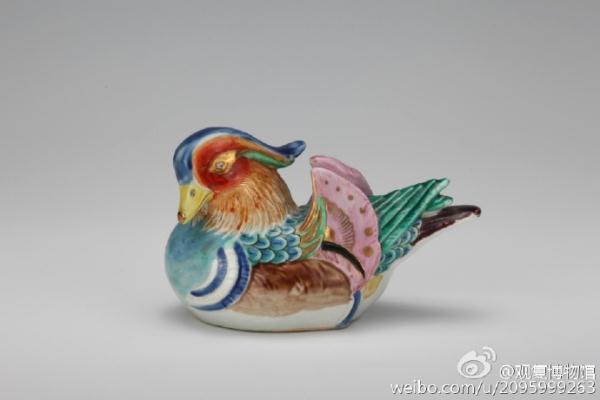 这件清代瓷塑青花粉彩描金鸳鸯摆件藏于观复博物馆。此件青花粉彩描金鸳鸯摆件,采用青花、粉彩两种工艺,华丽优美,两眼脉脉含情。眼部满描金,颊施酒晕妆,头顶青花羽冠,颈部矛形翎羽,通身色彩斑斓,充满光泽。青花是中国瓷器的主流品种之一,属釉下彩瓷。青花用含氧化钴的钴矿石为原料,在陶瓷坯体上描绘纹饰,再罩上一层透明釉,经高温还原焰一次烧成。钴料烧成后呈蓝色,具有着色力强、发色鲜艳、烧成率高、呈色稳定的特点。