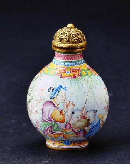 这件清代珐琅彩人物纹鼻烟壶藏于首都博物馆。此鼻烟壶有着折沿,束颈,溜肩,鼓腹,圈足,鎏金半圆形刻花盖。口沿及底边施金彩,腹部绘仕女婴戏图。底书“乾隆年制”4字篆书款。人物表情生动,绘画色彩淡雅,造型小巧而精致。