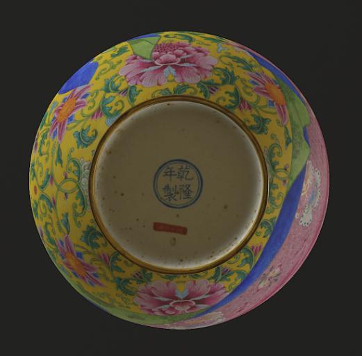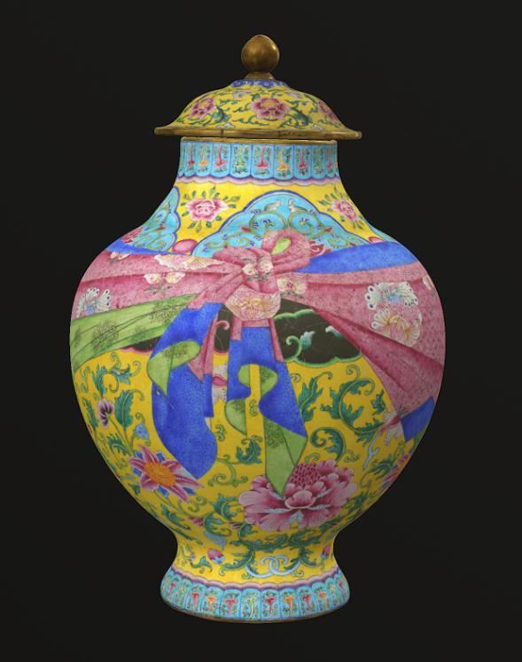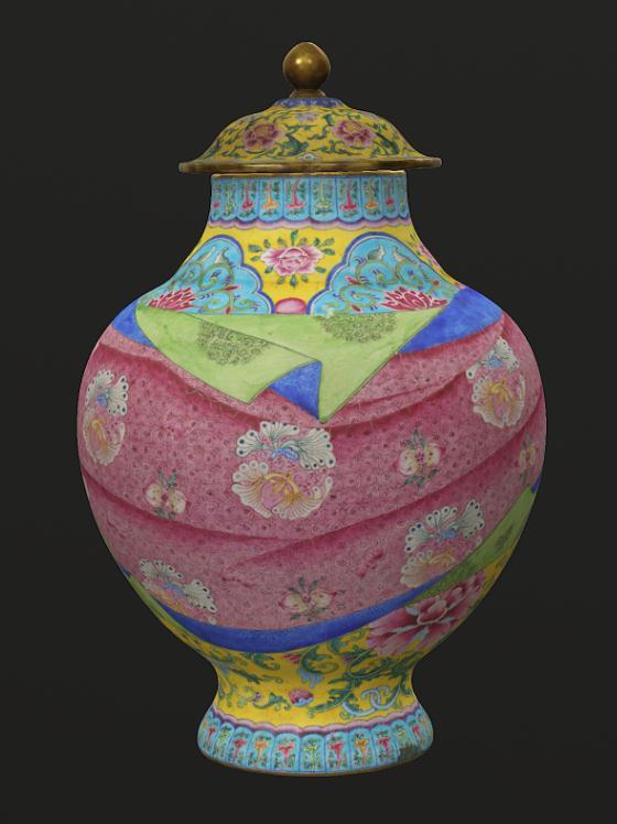 这件清代乾隆款画珐琅袱系纹盖罐珍藏于故宫博物院,此器直口微侈,溜肩,鼓腹,束腰,平底,浅圈足,有盖。袱系纹遮盖器腹的大半部分,红色部分以龟背锦为地,装饰蝴蝶、蝙蝠、桃实等吉祥图案,蓝色部分绘卷草纹。从稍远处观看,似由真实的锦袱包裹,栩栩如生。肩部四开光内绘西番莲。下腹部以黄釉为地,装饰各类缠枝花卉。外底中部蓝圈内有“乾隆年制”双排蓝料楷书款。