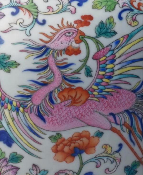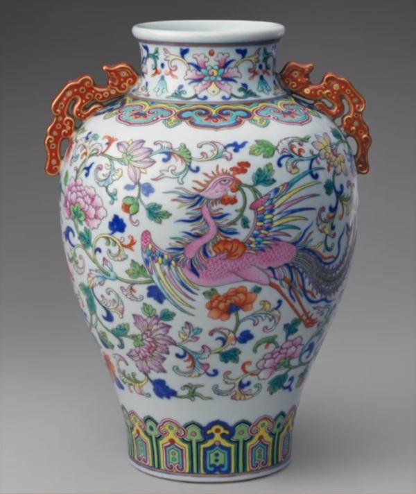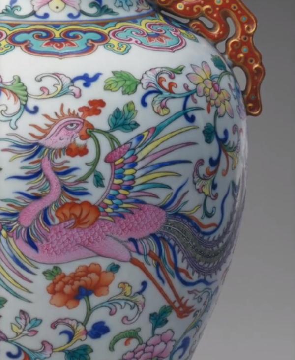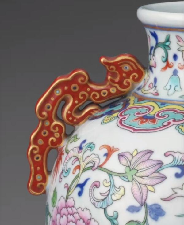 这件清代粉彩龙凤穿牡丹纹双耳瓶珍藏于故宫博物院,瓶撇口、束颈、长圆腹渐敛、圈足。肩部对称置红釉描金螭龙耳。瓶外壁主体绘粉彩龙凤穿牡丹花纹,以宝相花纹、如意云头纹、变形仰莲瓣纹为边饰。圈足内施白釉,署青花篆书“大清嘉庆年制”三行六字款。此瓶造型规整,设色艳丽,是一件颇能体现嘉庆官窑粉彩瓷器制作水平的佳作。