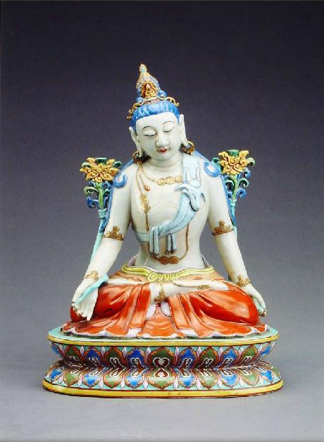 这件清代粉彩观音菩萨像藏于首都博物馆,通高28.7厘米底宽21.5厘米。此尊头梳高髻,发髻前有小化佛——阿弥陀佛,为观音菩萨身份的重要标识。面容端庄,双目下视,神态慈祥。大耳垂肩,耳下垂圆环。结跏趺端坐于仰覆莲台座上,头略右倾,双手下垂结印,并各持一莲茎,莲花齐肩开放。上身不着衣,左肩至右肋斜搭羚羊皮,下身着红色僧裙,腰间系以金色腰带。全身还有金色的璎珞、臂钏、腕钏、足钏等饰物。整尊造型大方,气质高雅,瓷质细腻、莹润,色彩鲜艳,具有乾隆宫廷造像的鲜明特点。
