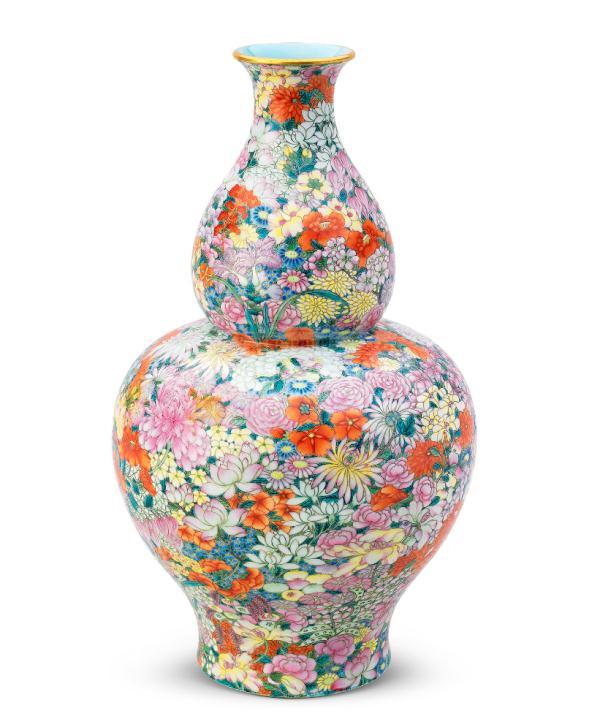 这件清代粉彩百花图葫芦瓶珍藏于中国国家博物馆,器呈葫芦式,粉彩绘百花图,用红、黄、紫、粉、白、蓝、绿等各色彩绘制各种花卉纹,外底施松石绿釉地,上红彩书“大清乾隆年制”六字三行篆书款。此器造型规整,绘制精湛,纹饰细腻,华贵精妍。