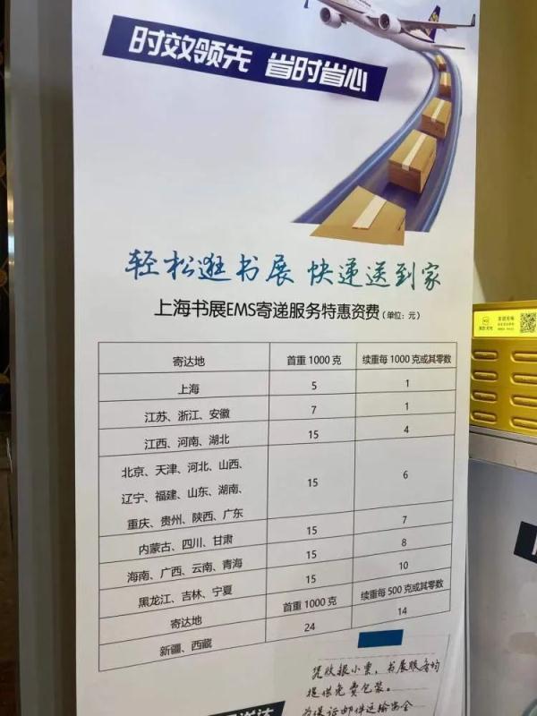 跟往年一样,上海书展总服务处也有邮政EMS专柜,如果你买了书嫌重,可以通过EMS快递到家,全国各地几乎都可以送达。以上海地区价格为例,首重1公斤寄送费5元,超过部分每公斤1元。该专柜生意不错,读者要寄送的,往往是一些大部头的盒装书。