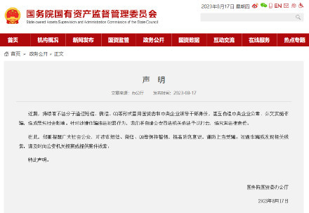 8月17日,国务院国有资产监督管理委员网站发布声明: