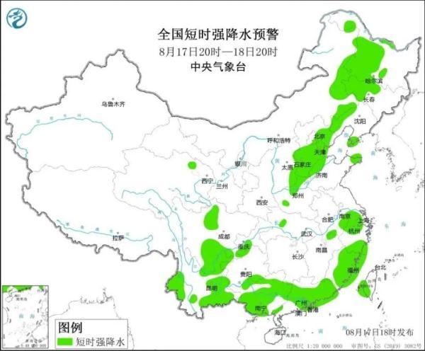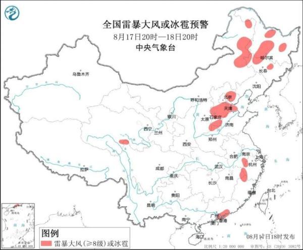 预计8月17日20时至18日20时,内蒙古东部、黑龙江中西部、吉林西部、河北中南部和东北部、北京东部、天津、河南北部、安徽南部、江西北部、浙江中部、福建西北部等地的部分地区将有8-10级雷暴大风或冰雹天气;内蒙古东部、黑龙江中西部、吉林中西部、辽宁西部、山西南部、河北、北京东部和西南部、天津、山东北部、河南北部、安徽南部、江苏南部、上海西部、浙江北部和南部、福建、四川中部、贵州西北部、云南、广西、广东、台湾岛南部等地的部分地区将有短时强降水天气,最大小时雨量30-50毫米,局地可达60毫米以上。