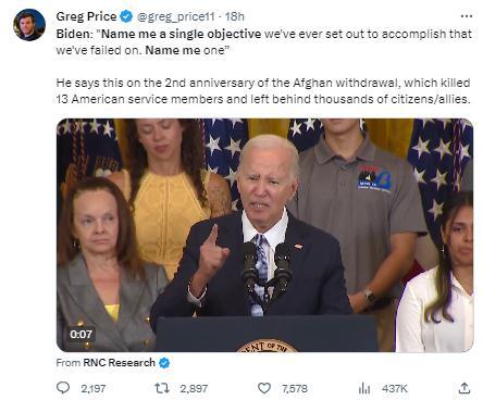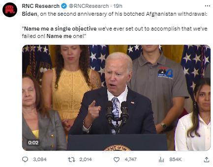 美国共和党全国委员会(RNC)运营的X(原推特)账号“RNCResearch”发文讽刺,“拜登,在他拙劣的阿富汗撤军两周年之际(说):‘给我举一个我们想要完成却失败了的目标。给我举一个!’”↓