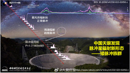 北京时间8月18日,国际科学期刊《自然·天文》发表了中国科学院国家天文台韩金林研究员领导的王绶琯巡天突击队的新成果,该团队利用中国天眼FAST成功探测并解析了一批脉冲星B2111+46磁层中零星雨滴般的微弱矮脉冲辐射,这种矮脉冲辐射族群是国际上其他射电望远镜难以观测的脉冲星辐射新形态,揭示了脉冲星辐射濒临熄灭时其磁层结构基本不变的物理事实。此次矮脉冲族群的发现为研究脉冲星辐射难题研究打开了一个新窗口,对揭示脉冲星磁层物理及其极端等离子体环境具有重要的科学意义。(记者吴月辉 图/中国科学院国家天文台)